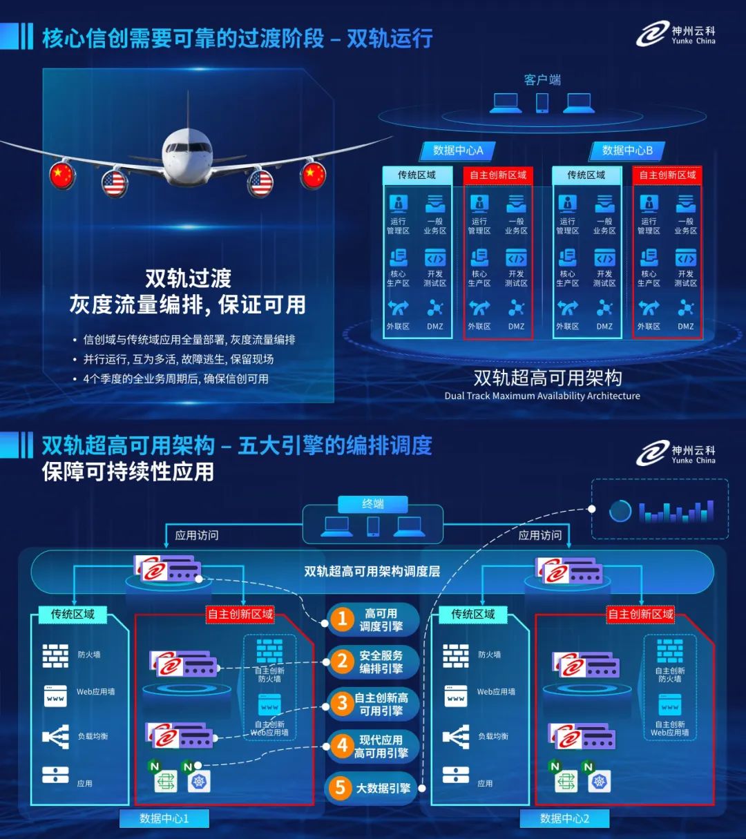 为助力金融业务高质量发展,更好地应对数字经济时代对可持续性的高要求,实现“信创”与“数字化”齐头并进,神州3044永利创新性的推出了核心信创·双轨过渡的超高可用架构。该架构在双活数据中心的分区调度基础上,增加信创域和非信创域的分域调度,实行信创域与传统域应用全量部署,使双中心运营变为双中心四区域并行运行,互为多活,将“0到1”的单轨建设道路变为分区分域协同的多活双轨超高可用架构。帮助客户在新架构下,保障“信创”的同时解决性能瓶颈,提升稳定性,保证应用可持续性,最终实现信创区域和非信创区域的平滑过渡,完成国产化替代目标。