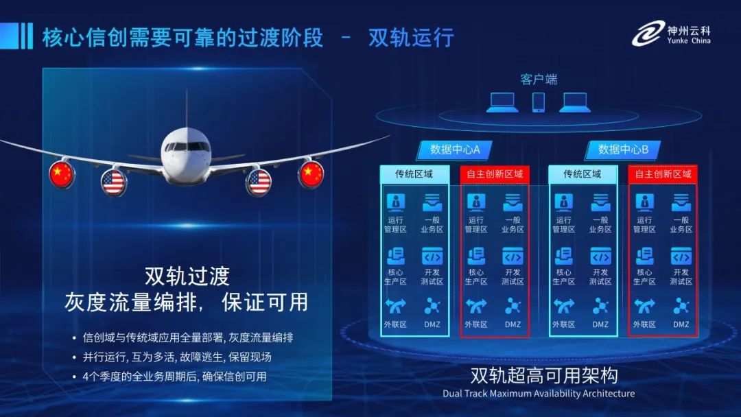 为帮助客户更好地应对数字经济时代对应用可持续性的高要求,实现信创与数字化兼得,神州3044永利推出了双轨超高可用架构。双轨超高可用架构在双活数据中心的分区调度基础上,增加信创域和非信创域的分域调度,实行信创域与传统域应用全量部署,使双中心运营变为双中心四区域并行运行,互为多活,将传统架构变为分区分域协同的多活双轨超高可用架构。帮助客户在新架构下,保障“信创”的同时解决性能瓶颈,提升稳定性,保证应用可持续性,最终实现信创区域和非信创区域的平滑过渡,完成国产化替代目标。”